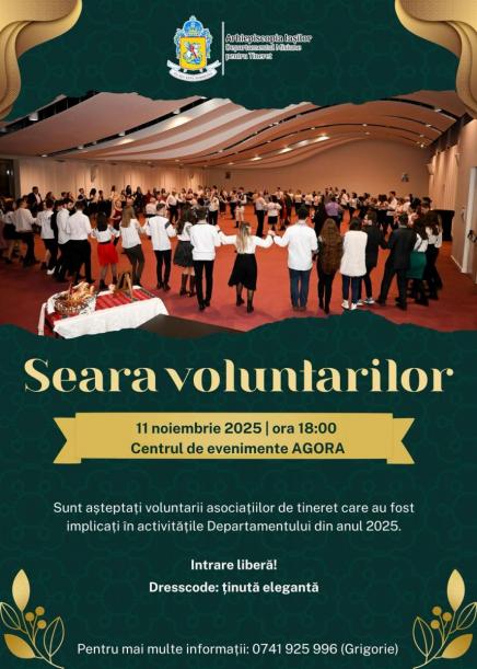 Asociația Studenților Creștini Ortodocși Români – Filiala Iași organizează evenimentul „O seară românească”, desfășurat la Centrul de Evenimente AGORA, în intervalul 18.00-22.00. Evenimentul este destinat publicului larg și îi are ca invitați pe: Angelica Flutur, Diana Penciuc, Mădălina Andrei, Petronela Popa, Denisa Georgiana Tudoran, Maria Tucan, Petruța Bădeliță, Delia și Denisa Babalean. În cadrul spectacolului caritabil va fi lansată campania „Moș Crăciun la copiii din spitale”, prin intermediul căreia, în preajma Crăciunului, fiecare copil internat la Spitalul „Sfânta Maria” din Iași va primi un dar. Intrarea se va face pe bază de donații: studenți – 35 lei; adulți – 40 lei.